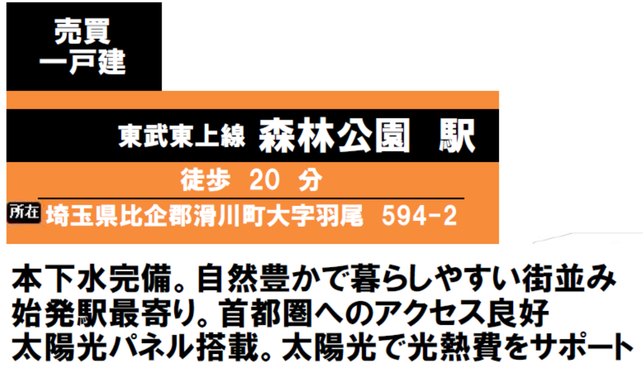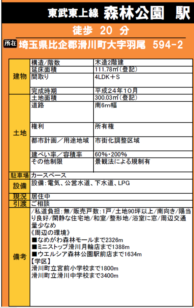 ☆比企郡滑川町大字羽尾 中古戸建て ★仲介手数料無料中古一戸建て! ☆東武東上線『森林公園駅』徒歩20分! ☆敷地面積90坪! ☆平成24年10月築、4SLDK中古住宅です! ☆太陽光発電搭載! ☆自然に囲まれた静かな環境! ☆南道路・敷地も広く陽当たり良好! ☆駐車場5台! ☆滑川町立宮前小学校、滑川中学校の通学区です ☆公営水道、本下水、プロパンガス ☆なめがわ森林モール(約2326m)、ミニストップ滑川月輪店(約1388m)、ウエルシア森林公園駅前店(約1634m) |