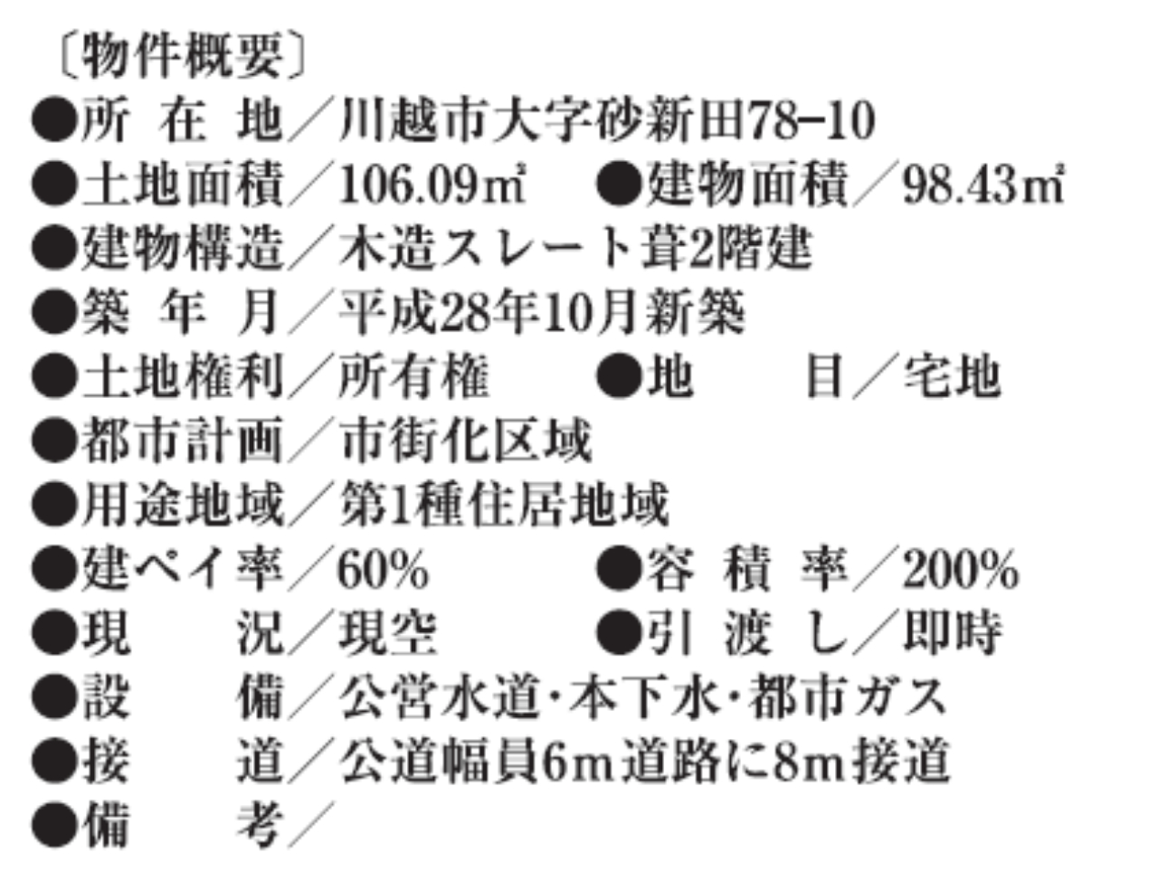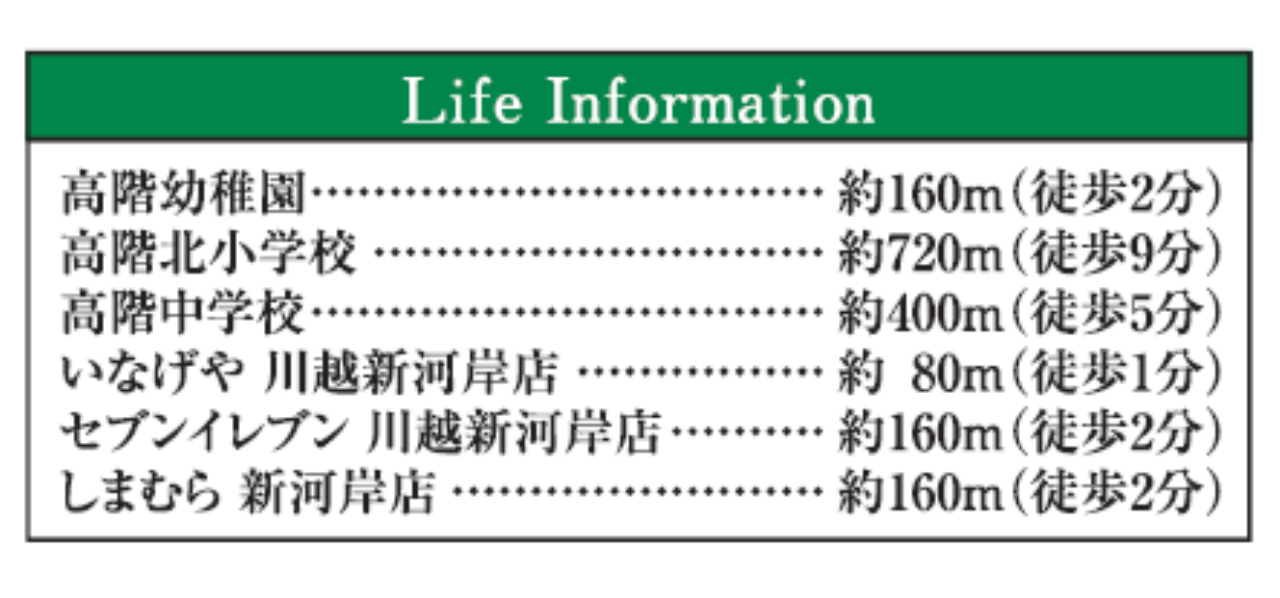 ☆川越市砂新田 中古一戸建て ☆東武東上線『新河岸駅』徒歩7分! ☆敷地面積32坪! ☆長期優良住宅! ☆平成28年10月築、4LDK中古戸建て! ☆近藤不動産開発分譲地! ☆築10年のきれいな住まい! ☆川越市立高階北小学校まで徒歩2分、高階中学校まで徒歩9分の通学距離です! ☆駐車場1台! ☆公営水道、本下水、都市ガス ☆高階幼稚園(約1160m)、いなげや川越新河岸店(約80m)、セブンイレブン川越新河岸店(約160m)、しまむら新河岸店(約160m) |