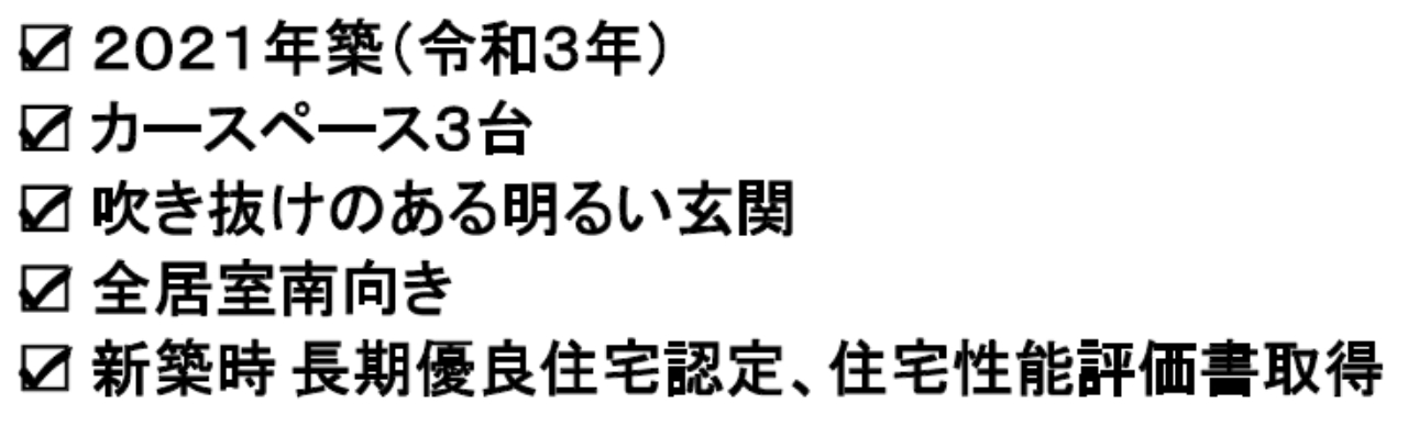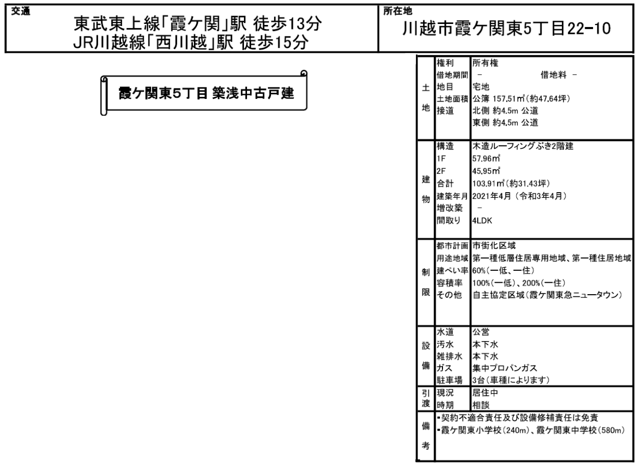☆川越市霞ヶ関東5丁目 中古一戸建て ☆東武東上線『霞ヶ関駅』徒歩13分! ☆JR川越線『西川越駅』徒歩15分! ☆敷地面積47坪! ☆令和3年4月築、4LDK中古戸建て! ☆新築時長期優良住宅認定、住宅性能評価書取得した物件! ☆全室南向きで日差しが取り込める間取り! ☆築浅で室内キレイにお使いです! ☆駐車場3台! ☆川越市立霞ヶ関北小学校まで徒歩3分、霞ヶ関中学校まで徒歩7分の通学距離です! ☆公営水道、本下水、集中プロパンガス ☆霞ヶ関東第4公園(約10m)、Seria(約1000m)、ファミリーマート(約940m)、ヤオコー(約1200m)、クリエイト(約970m)、マツモトキヨシ(約1390m) |