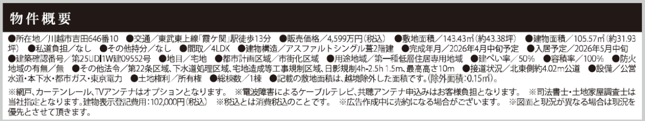 ☆川越市吉田5期 新築一戸建て ★新築仲介手数料無料! ☆東武東上線『霞ヶ関駅』徒歩13分! ☆敷地面積43坪! ☆収納や対面キッチンを備えた広々使える23帖のリビング! ☆バルコニー2箇所! ☆駐車場3台! ☆川越市立上戸小学校、鯨井中学校の通学区です ☆フラット35S利用可! ☆省エネBELS対象! ☆公営水道、本下水、都市ガス ☆ヤオコー霞ヶ関店(約850m) ※現地販売業者さんは売主ではございません。アンケート等の手続きをされますと当社での物件紹介(仲介料手数料無料)が出来なくなります。ご内覧を希望のお客様は当社にて立ち合い・ご案約をさせて頂きますのでお手数ですがTEL049-285-6300までお電話下さい。急いで現地へ向かいますので御連絡お待ちしております。 |