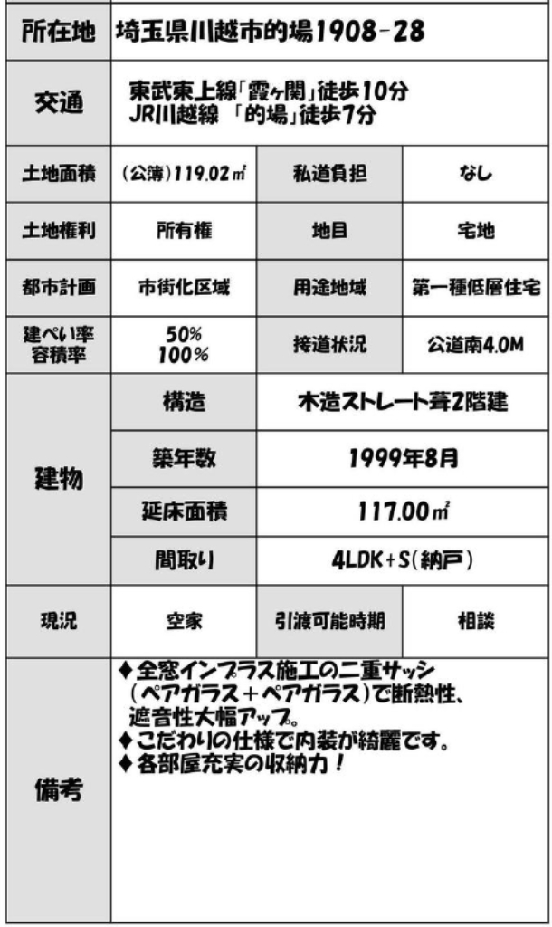 ☆川越市的場 中古建て ☆全窓二重サッシ仕様につき結露が出難く断熱・遮音性もアップします。 ☆約4.3帖のサービスルーム付き! ☆小屋裏収納庫付き! ☆南道路につき日当り良好! ☆駐車場 ☆大変きれいにお使いの住宅です。 ☆公営水道、本下水、都市ガス |