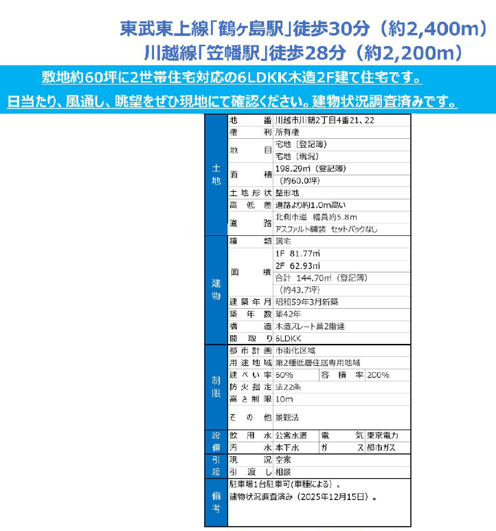 ☆川越市川鶴2丁目 中古戸建て ☆東武東上線『鶴ヶ島駅』徒歩30分! ☆JR川越線『的場駅』徒歩28分! ☆敷地面積59坪! ☆昭和59年3月築、6LDKKの中古住宅! ☆キッチンが1階と2階にあり二世帯住宅としても使用できます! ☆陽当り・風通し良好! ☆ゆとりのある広さで開放感のある家! ☆駐車場1台! ☆川越市立川越西小学校まで徒歩9分、川越西中学校まで徒歩13分の通学距離です! ☆公営水道、本下水、都市ガス ☆TAIRAYA川鶴店(約650m)、ローソン松ヶ丘3丁目店(約750m)、ウェルパークかわつる店(約450m)、川鶴公民館(約300m)、川鶴プラザクリニック(約400m)、川鶴保育園(約350m)、笠幡公園(約120m) |