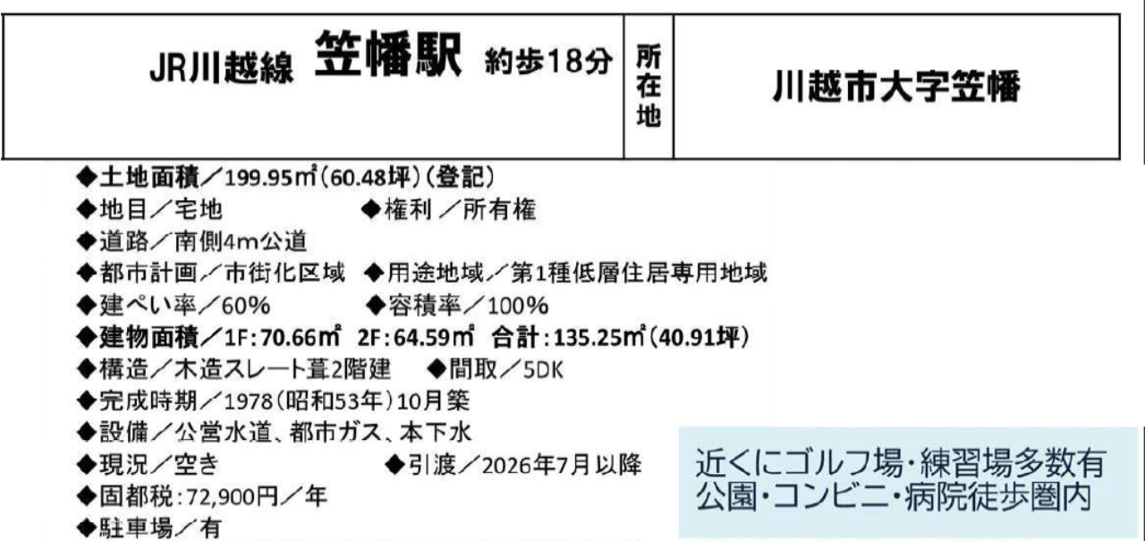 JR川越線笠幡駅まで 徒歩18分 |