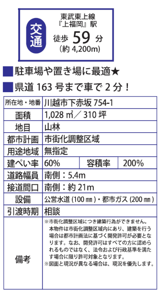 ☆川越市下赤坂 建築条件無売り地! ★仲介手数料半額土地! ☆東武東上線『上福岡駅』徒歩59分 ☆土地面積310坪! ☆建築条件はありません。 ☆南道路につき陽当たり良好! ☆資材置き場や駐車場などにも最適な広さ! ☆公営水道、都市ガス ☆34条12号許可を要す土地の為建築許可制限があります。 |