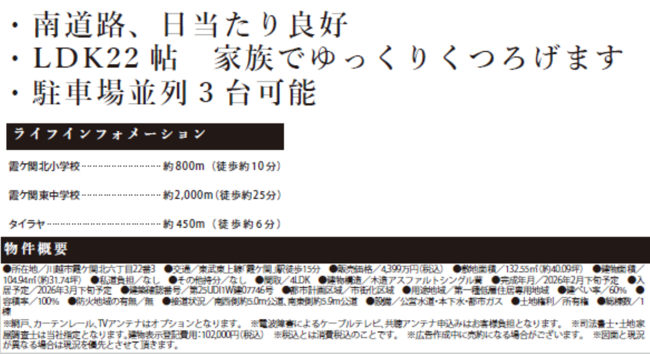 ☆川越市霞ヶ関北19期 新築一戸建て ★新築仲介手数料無料! ☆東武東上線『霞ヶ関駅』徒歩15分! ☆敷地面積40坪! ☆リビングイン階段や対面キッチンのあるリビングは21帖あり広々しています! ☆ウォークインクローゼットなど収納充実! ☆駐車場3台! ☆川越市立霞ヶ関北小学校まで徒歩10分、霞ヶ関東中学校まで徒歩25分の通学距離です! ☆フラット35S利用可! ☆省エネBELS対象! ☆公営水道、本下水、都市ガス ☆TAIRAYA川越霞ヶ関店(約450m) ※現地販売業者さんは売主ではございません。アンケート等の手続きをされますと当社での物件紹介(仲介料手数料無料)が出来なくなります。ご内覧を希望のお客様は当社にて立ち合い・ご案約をさせて頂きますのでお手数ですがTEL049-285-6300までお電話下さい。急いで現地へ向かいますので御連絡お待ちしております。 |