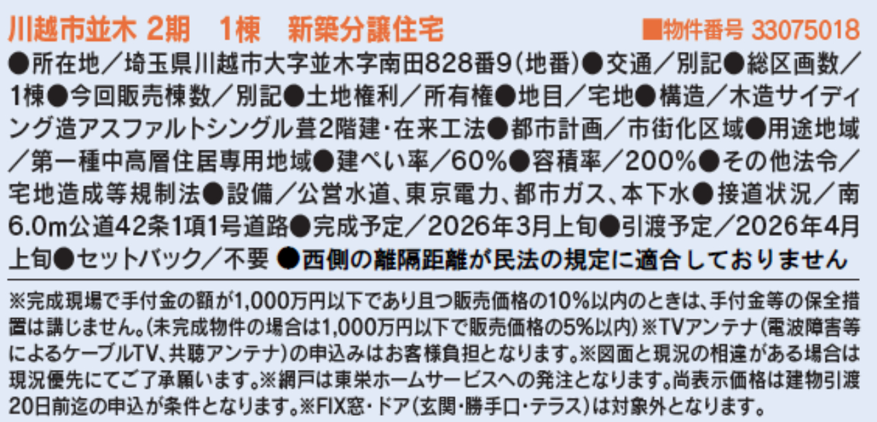 ☆ブルーミングガーデン川越市並木2期 新築一戸建て ★新築仲介手数料無料! ☆JR川越線『南古谷駅』徒歩7分! ☆敷地面積30坪! ☆駅徒歩7分・商業施設も充実した住環境! ☆ビルトイン駐車場1台+軽自動車1台! ☆ワンフロアタイプのリビングは対面キッチン付きで天井も高く開放感のあるお部屋! ☆2階洋室は生活スタイルに合わせて2部屋に間仕切り可能! ☆浄水器蛇口、24時間換気システム、節水型トイレ、食器洗浄乾燥機、浴室換気乾燥機、玄関断熱ドア、ポスト一体型宅配ボックス、テレビモニター付きインターホン、ハンドシャワー付き洗面化粧台、LED照明などの設備! ☆川越市立南古谷小学校まで徒歩5分、東中学校まで徒歩13分の通学距離です! ☆住宅性能評価書取得予定物件! ☆フラット35S利用可! ☆地震に強い耐震×制震ダンパー! ☆長期優良住宅! ☆省エネBELS対象! ☆公営水道、本下水、都市ガス ☆認定こども園泉の森川越幼稚園(約1208m)、南古谷保育園(約680m)、ドラッグストアセキ南古谷店(約197m)、ローソン川越木野目六角店(約311m)、ベルク南古谷店(約403m)、エコス木野目店(約589m)、セブンイレブン川越南古谷店(約604m)、ウニクス南古谷(約750m)、川越今泉郵便局(約815m)、南古谷市民センター(約893m) ※現地販売業者さんは売主ではございません。アンケート等の手続きをされますと当社での物件紹介(仲介料手数料無料)が出来なくなります。ご内覧を希望のお客様は当社にて立ち合い・ご案約をさせて頂きますのでお手数ですがTEL049-285-6300までお電話下さい。急いで現地へ向かいますので御連絡お待ちしております。 |