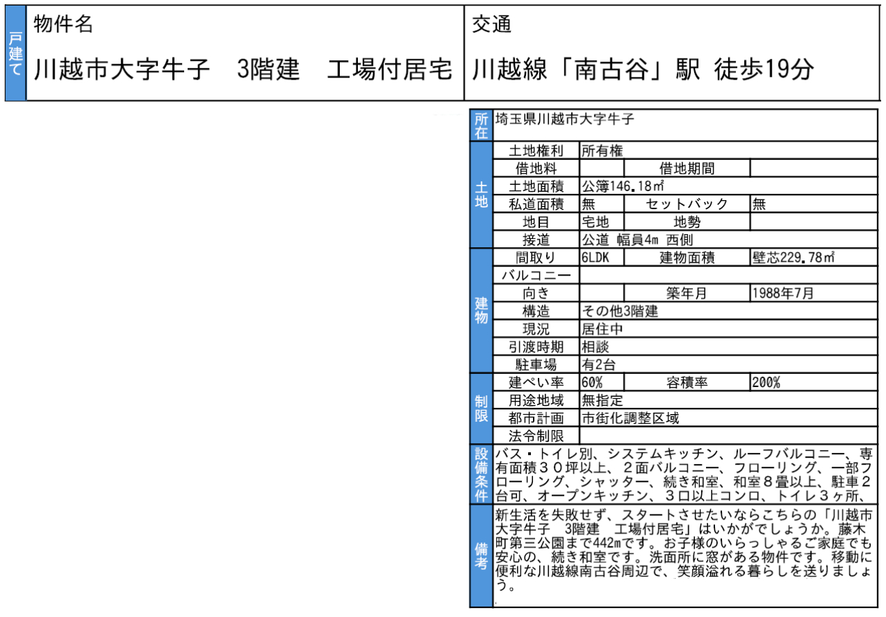 ☆川越市牛子 工場付き中古戸建て ☆JR川越線『南古家駅』徒歩19分! ☆敷地面積44坪! ☆昭和63年7月築、1階に工場がある6LDKの中古住宅です! ☆建物面積69坪! ☆工場として使われていた1階をガレージとしても使用できる広さです! ☆川越市立牛子小学校まで徒歩7分の通学距離です! ☆公営水道 ☆藤木町第三公園(約442m)、南古谷第二保育園(約718m)、新河岸腎クリニック(約1133m)、藤野整形外科(約1133m)、新河岸幼稚園(約1383m)、牛子東町公園(約510m)、イルカ薬局(約1069m) |