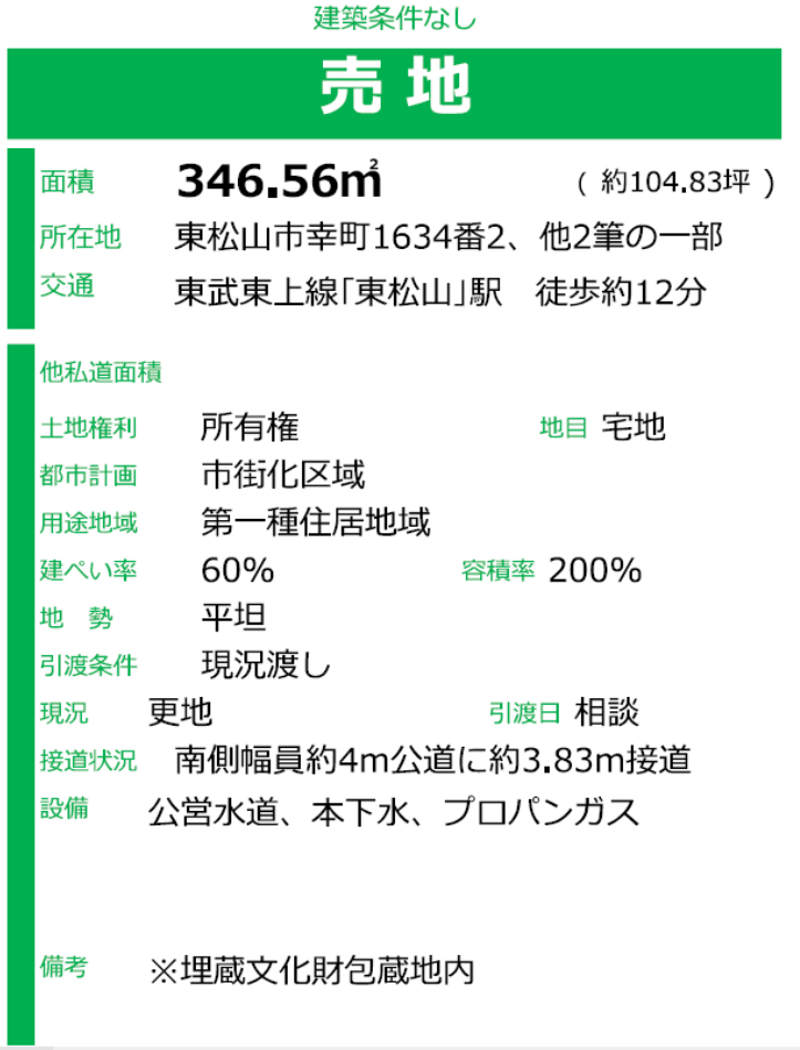 ☆東松山市幸町 建築条件無し売地! ☆東武東上線『東松山駅』徒歩12分! ☆敷地面積104坪! ☆建築条件はありません。お好きなハウスメーカーで建築できます! ☆広々した土地で陽当たり良好! ☆東松山市立新明小学校、東中学校の通学区です ☆公営水道、公共本下水、プロパンガス ☆どなたでも建築できる土地です!(34条11号適用含む) ☆生鮮市場TOP(約600m)、ミニストップ(約350m)、ウエルシア(約600m)、スーパービバホーム(約600m) |