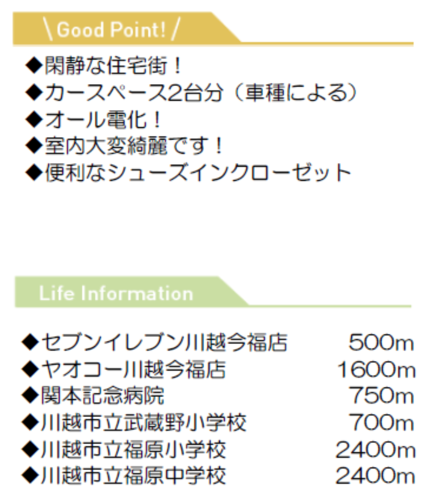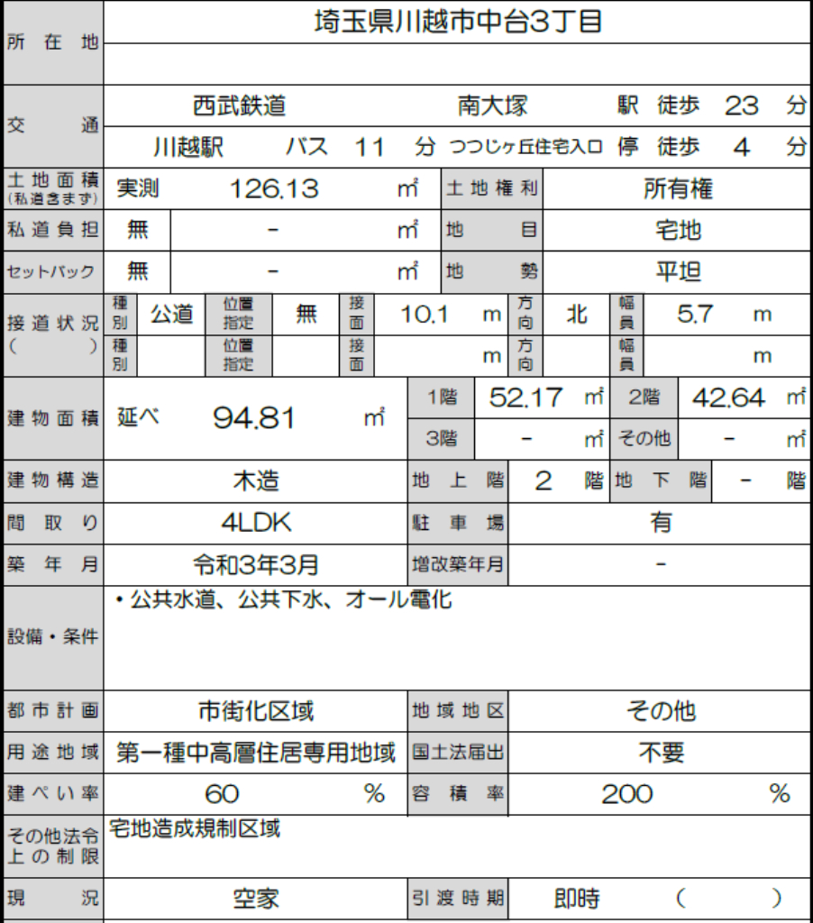 ☆川越市中台3丁目 中古戸建て ☆令和3年築の築浅中古戸建て! ☆西武新宿線 南大塚駅 徒歩23分 ☆オール電化住宅! ☆駐車場2台 ☆公営水道 |