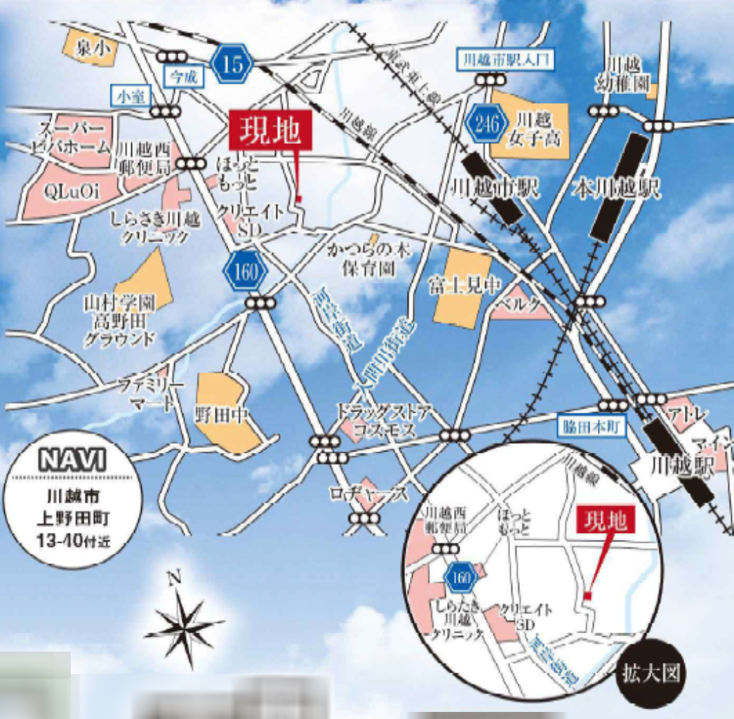 ☆川越市上野田町4期 建築条件無売り地 ★仲介手数料無料土地! ☆東武東上線『川越市駅』徒歩12分! ☆西武新宿線『本川越駅』徒歩14分! ☆土地面積39坪! ☆建築条件付きの売地です。参考プランがあります! ☆どなたでも建築できる土地です! ☆川越市立泉小学校まで徒歩12分、野田中学校まで徒歩13分の通学距離です! ☆公営水道、公共本下水、都市ガス ☆どなたでも建築できる土地です!(34条11号適用含む) ☆かつらの木第二保育園…徒歩5分、川越幼稚園…徒歩16分、クリエイトS・D…徒歩4分、ファミリーマート…徒歩8分、ベルク…徒歩12分、スーパービバホーム…徒歩12分、ロヂャース…徒歩14分、野田町1丁目児童遊園…徒歩5分 |