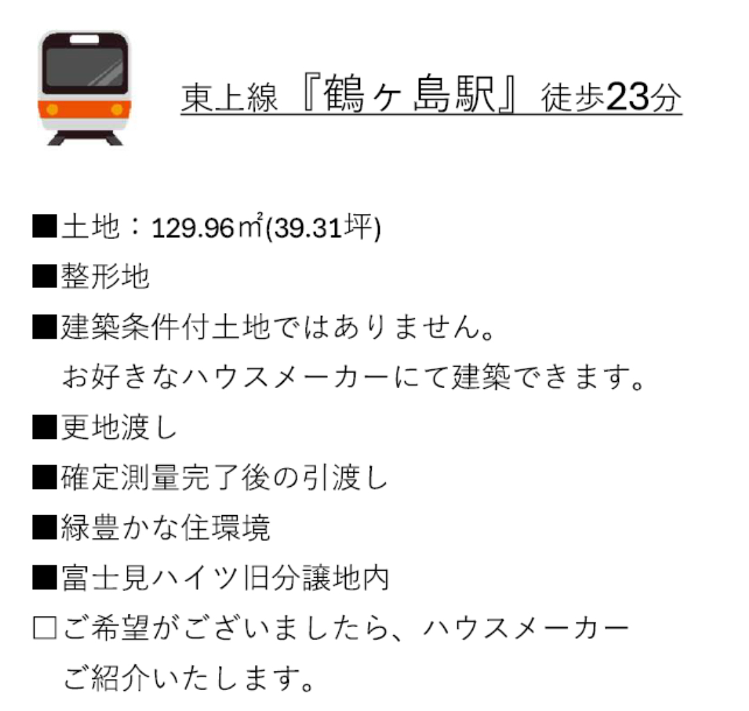 東武東上線鶴ヶ島駅まで 徒歩23分 |