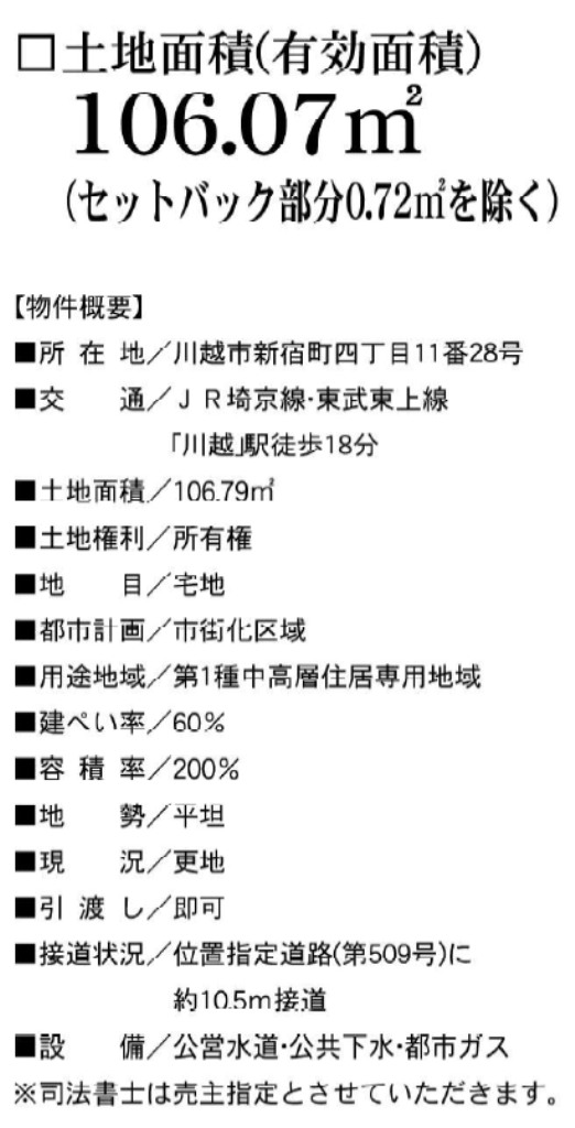 ☆土地面積32坪! ☆建築条件無し! ☆川越市立新宿小学校まで徒歩7分、城南中学校まで徒歩2分! ☆公営水道、公共本下水、都市ガス ☆どなたでも建築できる土地です!(34条11号適用含む) |