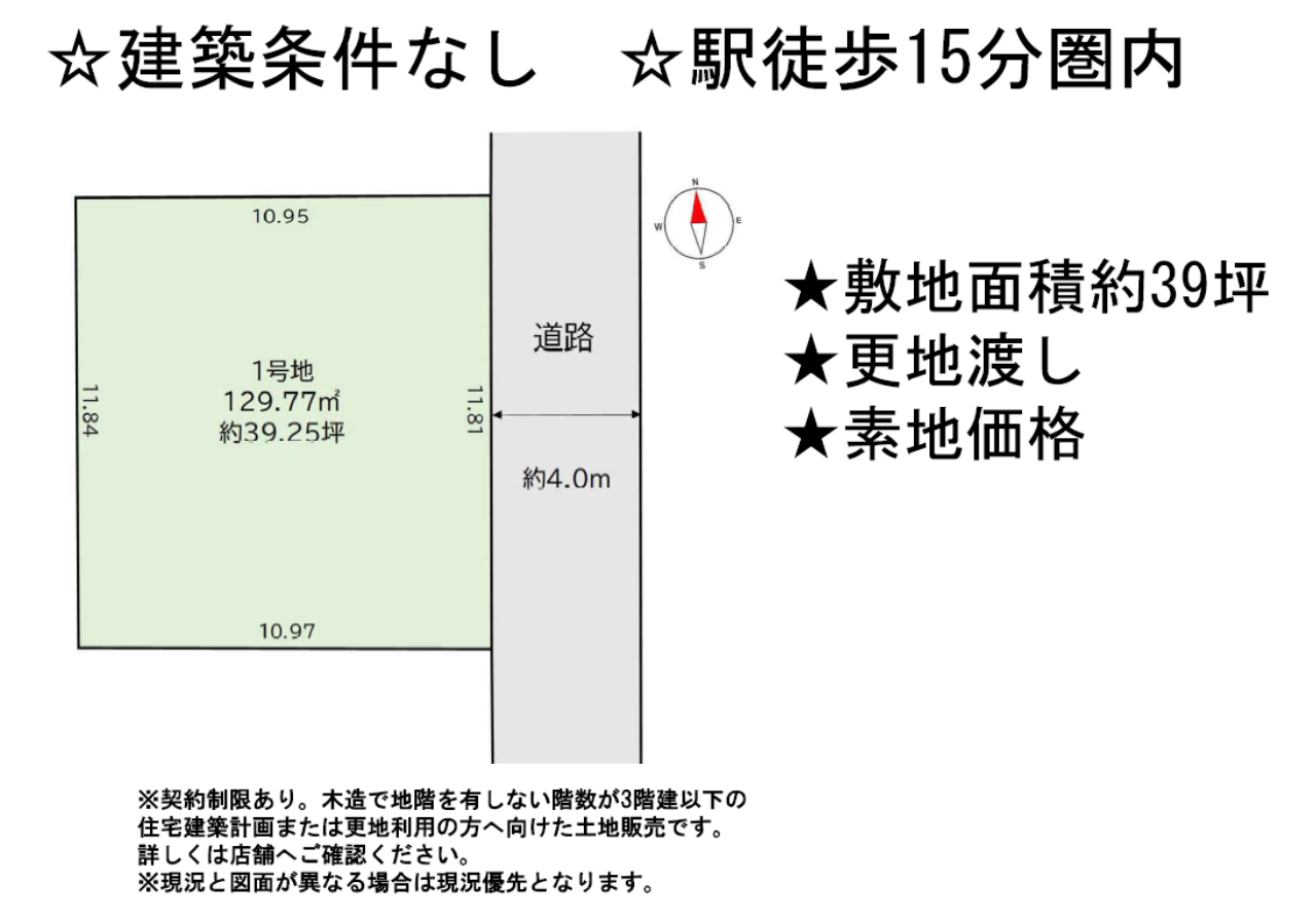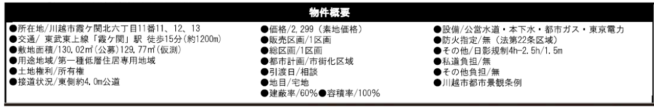 >☆土地面積39坪! ☆建築条件無し! ☆川越市立霞ヶ関北小学校まで徒歩15分! ☆公営水道、公共本下水、都市ガス ☆どなたでも建築できる土地です!(34条11号適用含む) |