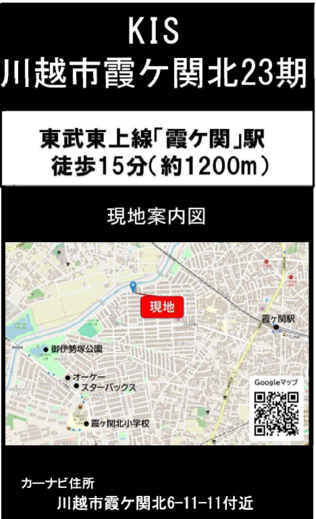 ☆川越市霞ヶ関北23期 建築条件無売り地 ☆東武東上線『霞ヶ関駅』徒歩15分! ☆土地面積39坪! ☆建築条件はありません。お好きなハウスメーカーで建築できます! ☆プランが立てやすい整形地! ☆川越市立霞ヶ関北小学校まで徒歩15分、霞ヶ関東中学校まで徒歩28分の通学距離です! ☆公営水道、公共本下水、都市ガス ☆どなたでも建築できる土地です!(34条11号適用含む) ☆TAIRAYA川越霞ヶ関店(約500m)、ファミリーマート川越吉田店(約450m) |