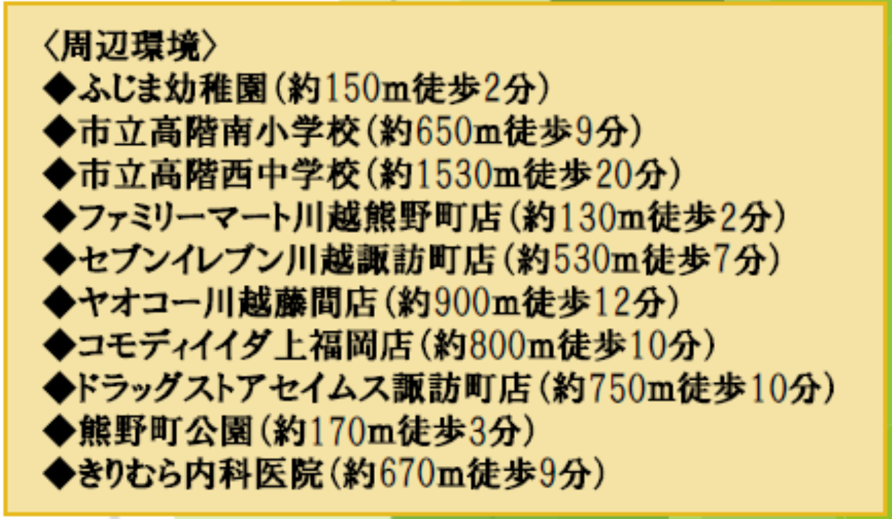 ☆川越市熊野町 中古一戸建て ☆東武東上線『上福岡駅』徒歩12分! ☆敷地面積87坪! ☆平成元年6月築、部屋数多い5DK中古住宅です! ☆広いお庭付き! ☆陽当たり良好です! ☆カーポート1台! ☆川越市立高階南小学校、高階西中学校の通学区です ☆公営水道、本下水、都市ガス ☆ファミリーマート川越熊野町店(約130m)、セブンイレブン川越諏訪町店(約530m)、ヤオコー川越藤間店(約900m)、コモディイイダ上福岡店(約800m)、ドラッグセイムス諏訪町店(約750m)、熊野町公園(約170m)、きりむら内科医院(約670m) |
