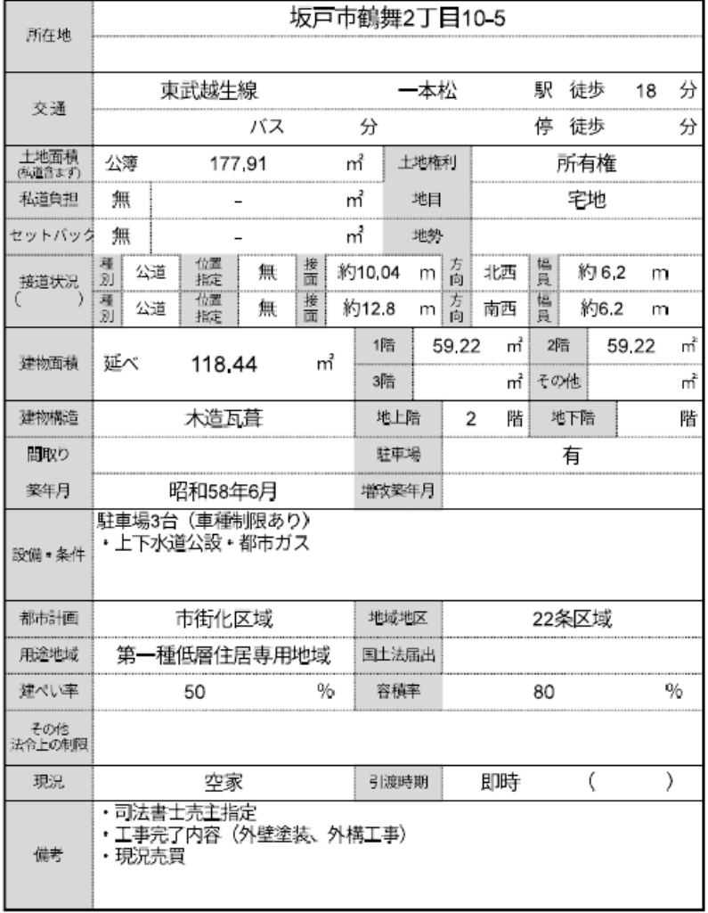 ☆坂戸市鶴舞2丁目 中古戸建て ☆敷地53坪! ☆大家族・趣味のお部屋におススメの5LDK! ☆公営水道、本下水、都市ガス ☆駐車場2台 ☆道路や区画の整った住宅地! ☆南西12m道路 ☆角地 |