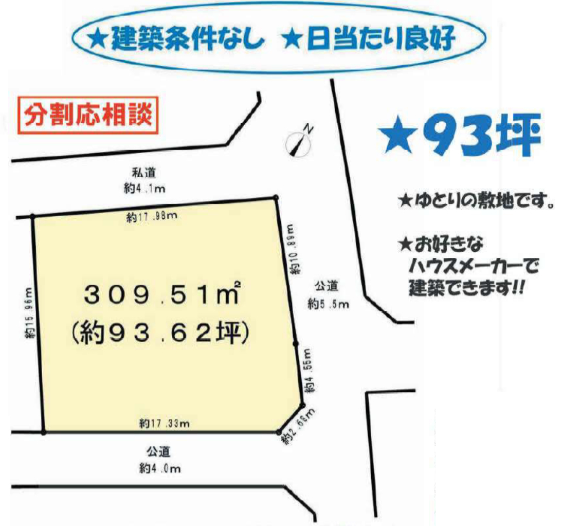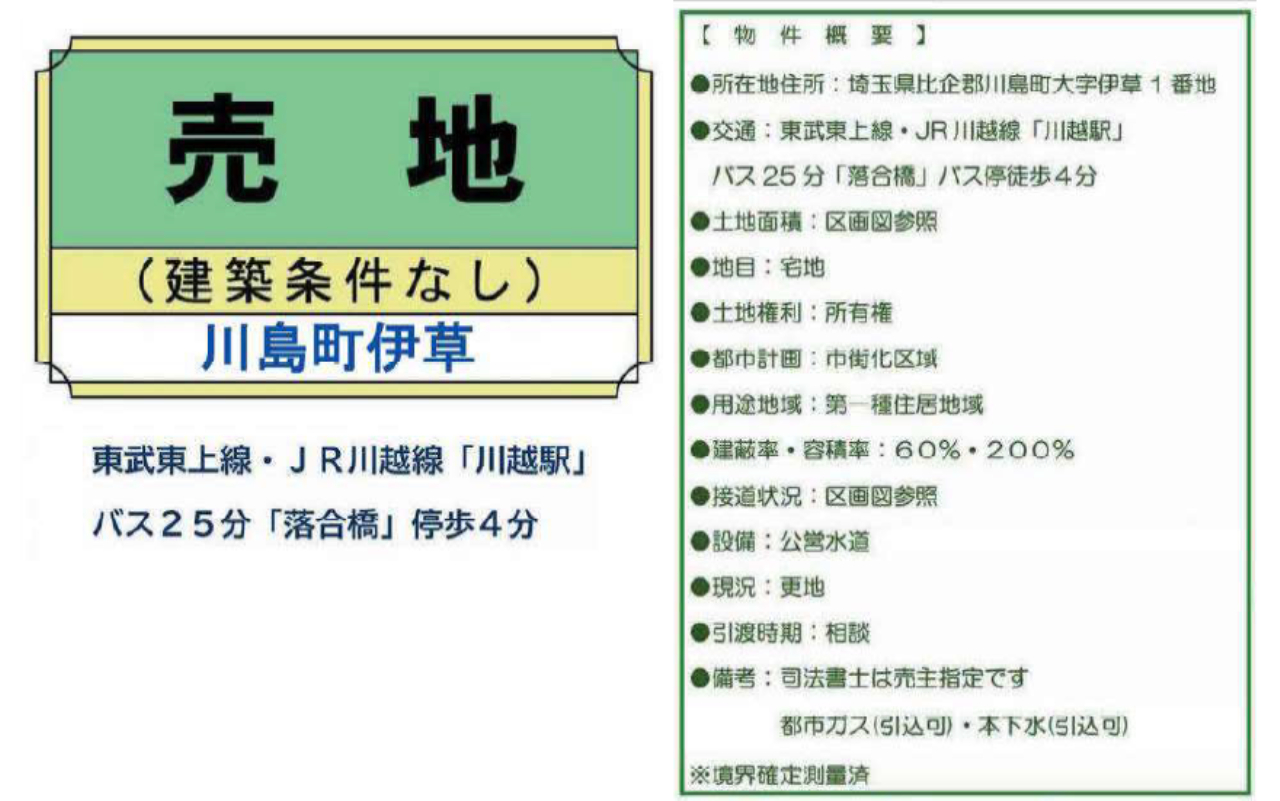 ☆土地面積93坪! ☆建築条件無し! ☆3方面道路・陽当たり良好! ☆川島町立伊草小学校、川島中学校の通学区 ☆公営水道、公共本下水(引込可)、都市ガス(引込可) ☆どなたでも建築できる土地です!(34条11号適用含む) |