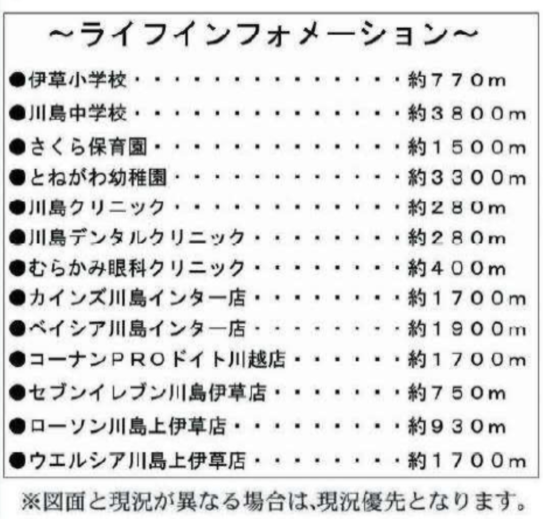 ☆比企郡川島町伊草 建築条件無売り地 ☆東武東上線『川越駅』バス25分、バス停『落合橋』停歩4分! ☆土地面積93坪! ☆建築条件はありません。お好きなハウスメーカーで建築できます! ☆分割購入応相談! ☆3方面道路につき開放感のある土地! ☆陽当たり良好! ☆川島町立伊草小学校、川島中学校の通学区です ☆公営水道、公共本下水(引込可)、都市ガス(引込可) ☆どなたでも建築できる土地です!(34条11号適用含む) ☆さくら保育園(約1500m)、とねがわ幼稚園(約3300m)、川島クリニック(約280m)、川島デンタルクリニック(約280m)、むらかみ眼科クリニック(約400m)、カインズ川島インター店(約1700m)、ベイシア川島インター店(約1900m)、コーナンRPOドイト川越店(約1700m) |