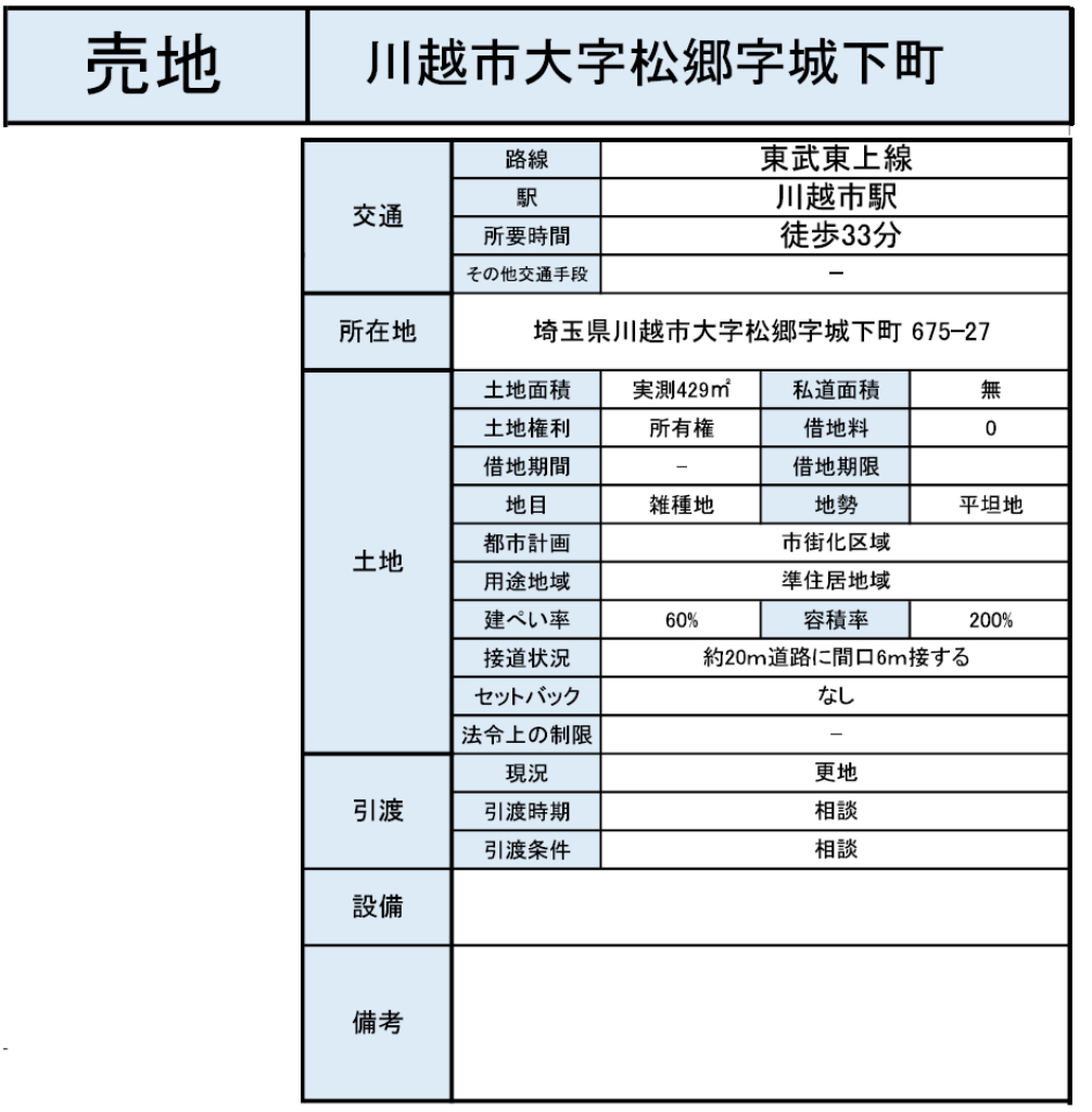 ☆土地面積129坪! ☆建築条件無し! ☆資材置き場や店舗などの建築にも! ☆川越市立第一小学校、第一中学校の通学区 ☆公営水道、公共本下水 ☆どなたでも建築できる土地です!(34条11号適用含む) |