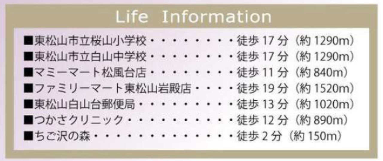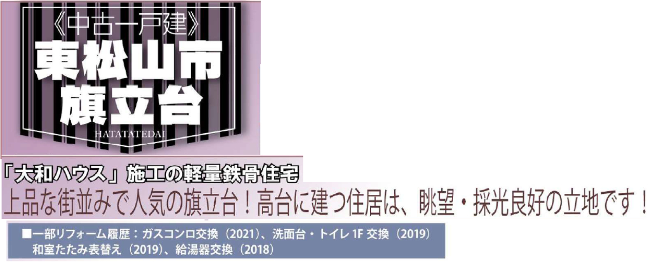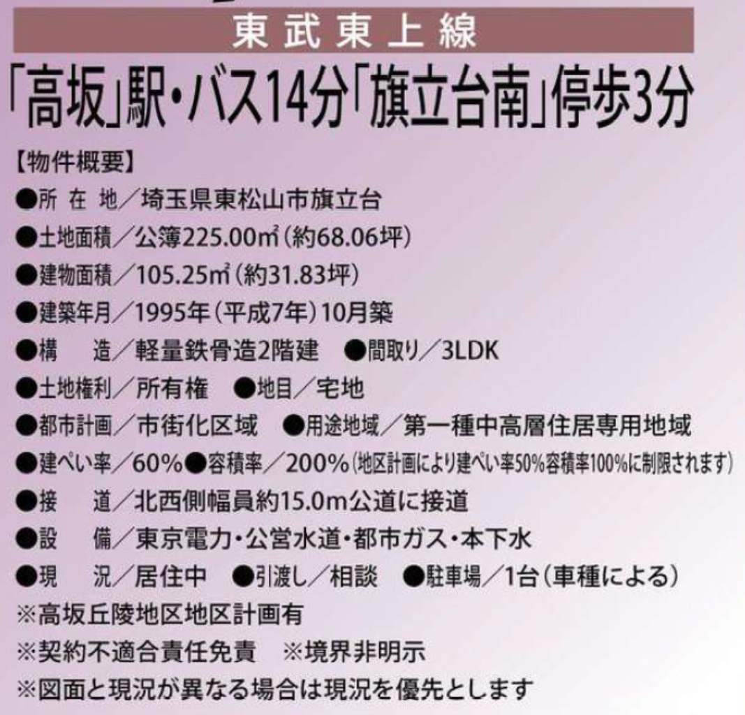 ☆東松山市旗立台 中古戸建て ☆東武東上線『東松山駅』バス14分、バス停『旗立台』停歩3分! ☆敷地面積68坪! ☆平成7年10月築、3LDK中古住宅です! ☆大和ハウス施工の軽量鉄骨造! ☆高台につき眺望・陽当たり良好です! ☆一部リフォーム歴有! ☆駐車場1台! ☆東松山市立桜山小学校、白山中学校まで徒17分の通学距離です! ☆公営水道、本下水、都市ガス ☆マミーマート松風台店…徒歩11分、ファミリーマート東松山岩殿店…徒歩19分、東松山白山台郵便局…徒歩13分、つかさクリニック…徒歩12分、ちご沢の森…徒歩2分 |