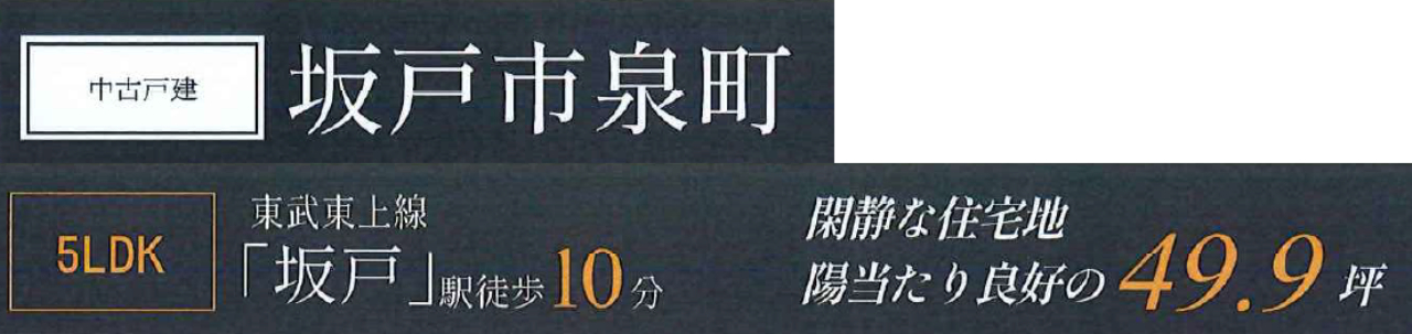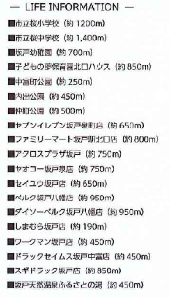 ☆坂戸市泉町 中古戸建て ★仲介手数料無料中古一戸建て! ☆東武東上線『坂戸駅』徒歩10分! ☆敷地面積49坪! ☆南道路につき陽当たり良好です! ☆平成12年12月築、部屋数が多い5LDKの中古住宅! ☆全室収納スペースあり! ☆駐車場2台! ☆坂戸市立桜小学校、桜中学校の通学区です ☆公営水道、本下水、プロパンガス ☆子どもの夢保育園北口ハウス(約850m)、中富町公園(約250m)、内出公園(約450m)、仲町公園(約500m)、セブンイレブン坂戸泉町店(約650m)、ファミリーマート坂戸駅北口店(約800m)、アクロスプラザ坂戸(約750m)、ヤオコー坂戸泉店(約750m)、セイユウ坂戸店(約650m)、ベルク坂戸八幡店(約950m)、ダイソーベルク坂戸八幡店(約950m)、しまむら坂戸店(約190m)、ワークマン坂戸店(約450m)、ドラッグセイムス坂戸中富店(約450m)、スギドラッグ坂戸店(約850m)、坂戸天然温泉ふるさとの湯(約450m) |