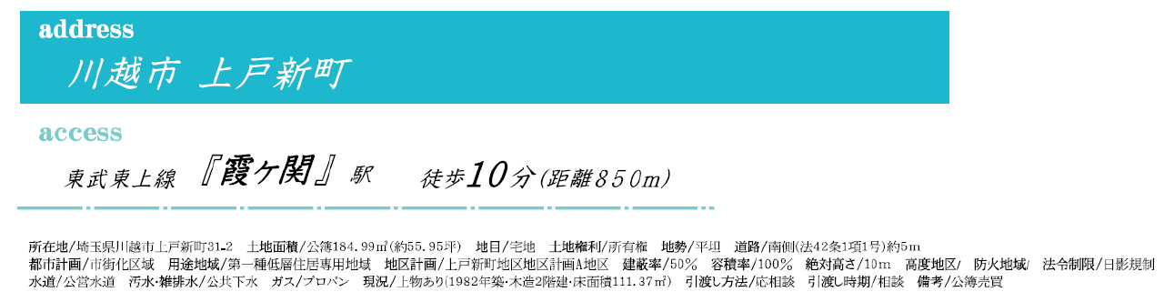 ☆川越市上戸新町 建築条件無売り地 ☆東武東上線『霞ヶ関駅』徒歩10分! ☆土地面積55坪! ☆建築条件はありません。お好きなハウスメーカーで建築できます! ☆南道路につき陽当たり良好! ☆駅まで徒歩10分、交通便利・生活環境の良い場所! ☆川越市立霞ヶ関東小学校まで徒歩8分、霞ヶ関東中学校まで徒歩12分の通学距離です! ☆公営水道、公共本下水、プロパンガス ☆どなたでも建築できる土地です!(34条11号適用含む) ☆川越白ゆり幼稚園…徒歩7分、ミニストップ川越上戸店…徒歩10分、ヤオコー川越霞ヶ関店…徒歩13分、あおい公園…徒歩3分 |