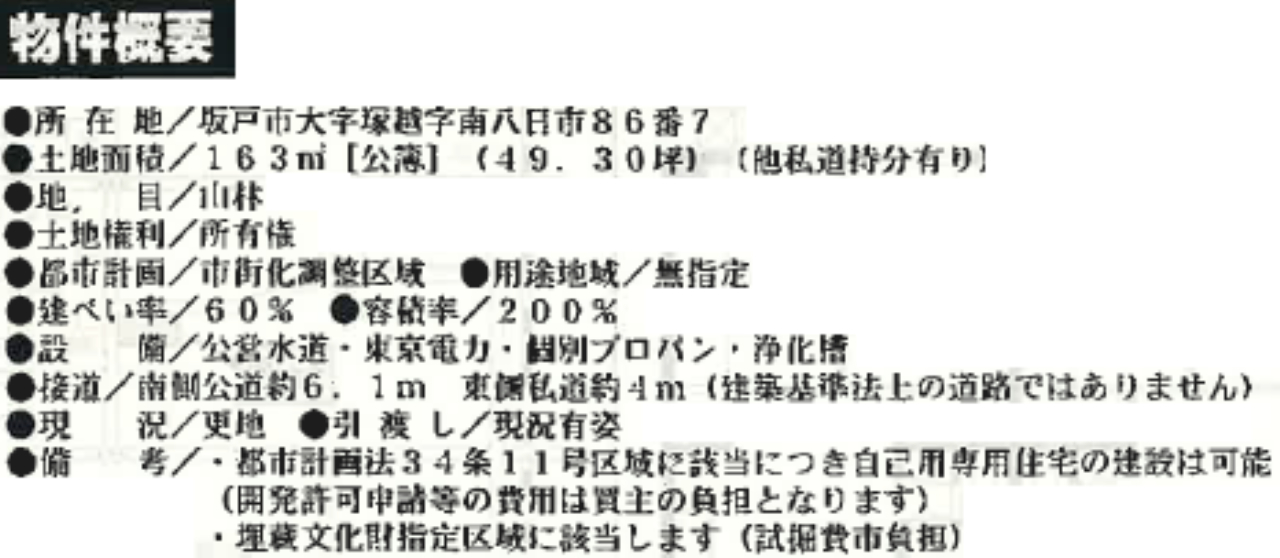 ☆坂戸市塚越 建築条件無売り地! ★仲介手数料半額! ☆敷地面積49.3坪※他私道持ち分有 ☆どなたでも建築できる土地です!(34条11号適用含む) ☆日当り良好! ☆公営水道、合併浄化槽、プロパンガス、東南角地につき陽当たり良好!南6.1M道路×東私道4.0道路! |