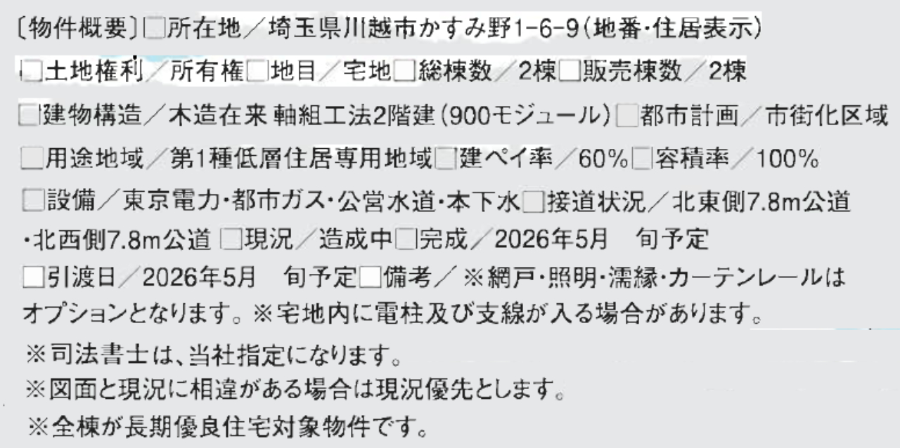 【2号棟】 ☆リーブルガーデン川越かすみ野第3 新築一戸建て 全2棟現場 ★新築仲介手数料無料! ☆JR川越線『笠幡駅』徒歩17分! ☆ウォークインクローゼットのある4LDK! ☆住宅性能評価書取得予定物件! ☆フラット35S利用可! ☆長期優良住宅! ☆地盤サポートシステム20年保証あり! ☆駐車場2台 ☆川越市立霞ヶ関南小学校まで徒歩2分です! ☆公営水道、本下水、都市ガス ☆セブンイレブン川越笠幡店(約553m)、武蔵野銀行霞ヶ関支店(約466m)、川越笠幡郵便局(約94m)、ドラッグストアセキ笠幡店(約611m) ※現地販売業者さんは売主ではございません。 アンケート等の手続きをされますと当社での物件紹介(仲介料手数料無料)が出来なくなります。ご内覧を希望のお客様は当社にて立ち合い・ご案内をさせて頂きますのでお手数ですがTEL049-285-6300までお電話下さい。急いで現地へ向かいますので御連絡お待ちしております。 |