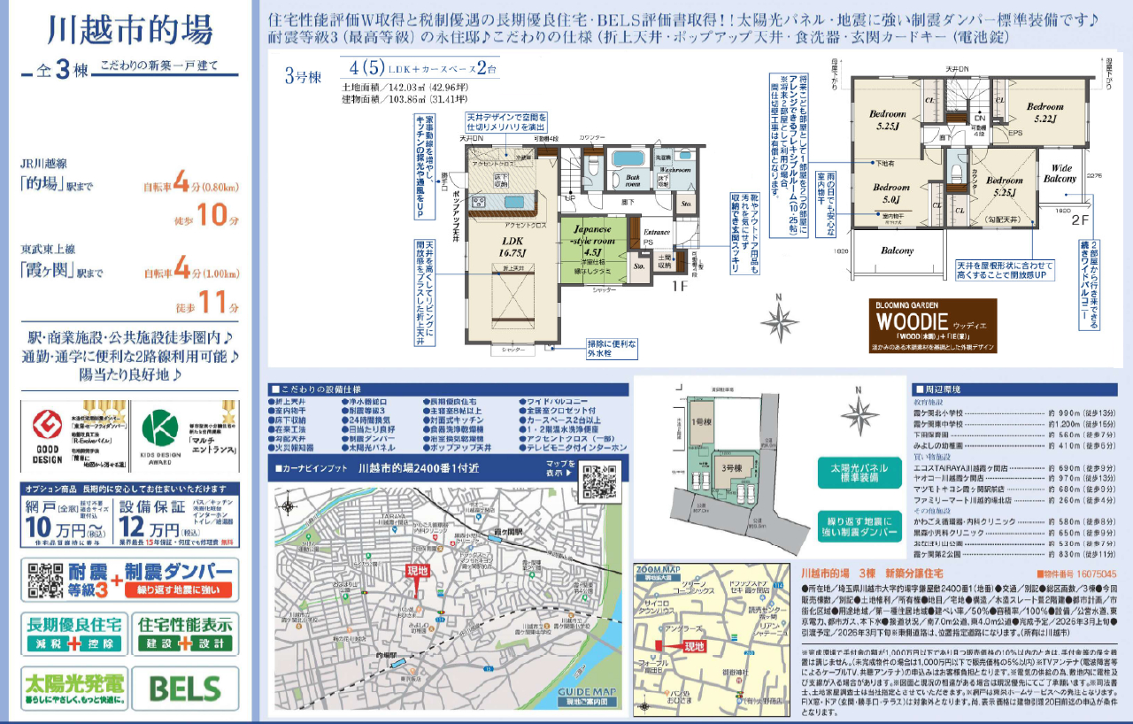 【3号棟】 ☆川越市的場 新築一戸建て 全3棟現場 ★新築仲介手数料無料! ☆JR川越線『的場駅』徒歩10分! ☆東武東上線『霞ヶ関駅』徒歩11分! ☆敷地面積42坪! ☆天井高で開放感があるリビング! ☆南道路につき陽当たり良好! ☆2階の10.25帖洋室はライフスタイルに合わせて間仕切り可能! ☆駐車場2台! ☆太陽光発電システムあり! ☆長期優良住宅! ☆住宅性能評価書取得予定物件! ☆フラット35S利用可! ☆耐震×制震装置採用物件! ☆川越市立霞ヶ関北小学校まで徒歩13分、霞ヶ関東中学校まで徒歩15分の通学距離です! ☆公営水道、本下水、都市ガス ☆下田保育園(約560m)、みよしの幼稚園(約410m)、エコスTAIRAYA川越霞ヶ関店(約690m)、ヤオコー川越霞ヶ関店(約970m)、マツモトキヨシ霞ヶ関駅前店(約680m)、ファミリーマート川越的場北店(約260m)、かわごえ循環器・内科クリニック(約5808m)、黒森小児科クリニック(約650m)、おなぼり山公園(約530m)、霞ヶ関第二公園(約830m) ※現地販売業者さんは売主ではございません。アンケート等の手続きをされますと当社での物件紹介(仲介料手数料無料)が出来なくなります。ご内覧を希望のお客様は当社にて立ち合い・ご案約をさせて頂きますのでお手数ですがTEL049-285-6300までお電話下さい。急いで現地へ向かいますので御連絡お待ちしております。 |