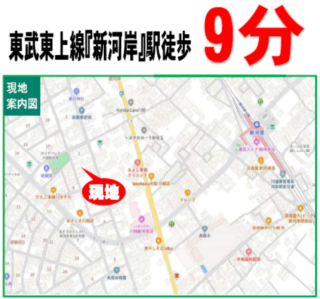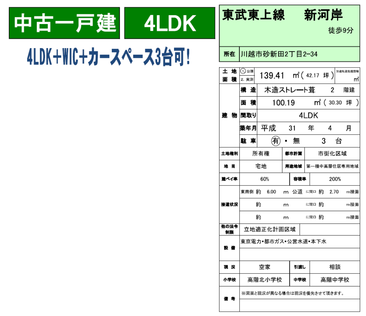 ☆川越市砂新田2丁目 中古戸建て ☆東武東上線『新河岸駅』徒歩9分! ☆敷地面積42坪! ☆平成31年4月築、4LDK中古住宅! ☆対面キッチン付きのリビング! ☆2WAYで行き来できる和室! ☆駐車場3台! ☆川越市立高階北小学校まで徒歩8分、高階中学校まで徒歩9分の通学距離です! ☆公営水道、本下水、都市ガス ☆東武ストア(約745m)、生鮮市場(約825m)、ファミリーマート(約153m)、ドラッグストアセキ(約459m) |