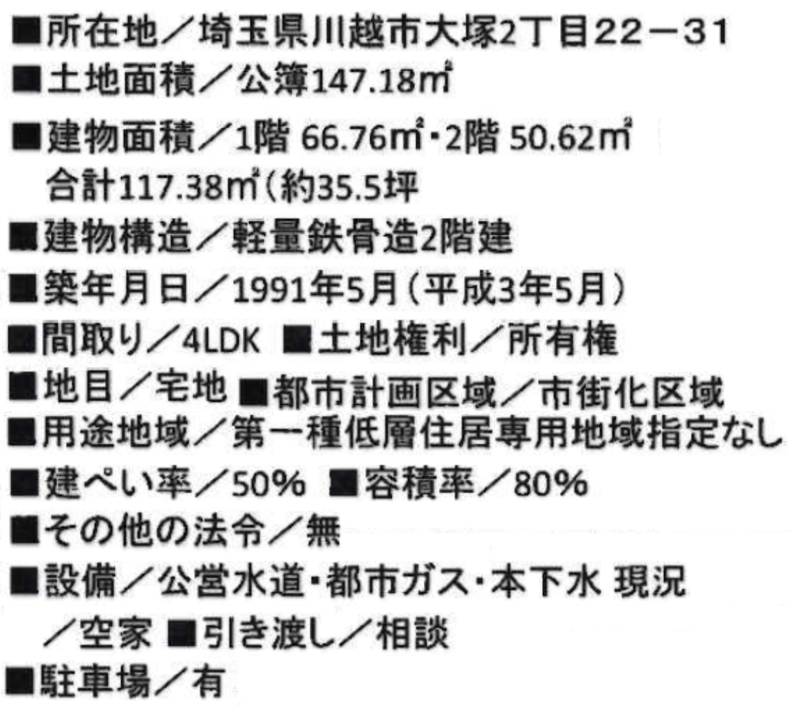 ☆川越市大塚2丁目 セキスイハイム施工の注文住宅 ★仲介手数料半額 ☆リフォーム済み! 【リフォーム箇所】システムキッチン交換、TVモニター付きインターホン、ユニットバス交換、トイレ交換、シャンプードレッサー交換、スイッチコンセント、シーディング、全室クロス貼替済み、照明交換、網戸張替、フロアータイル貼替、畳表替、襖貼替、ポスト設置、ハウスクリーニング! ☆東武東上線『川越駅』徒歩25分! ☆敷地面積44坪! ☆南4m道路に面した陽当りの良い物件です! ☆システムキッチン! ☆広々とした玄関ホール! ☆駐車場並列2台! ☆川越市立大塚小学校まで徒歩2分、城南中学校まで徒歩22分の通学距離です! ☆公営水道、本下水、都市ガス ☆南双葉幼稚園(約440m)、おおぞら保育園(約891m)、ファミリーマート小坂旭町店(約360m)、ビッグエー新宿店(約410m)、ウエルシア川越新宿店(約455m)、ベルク川越むさし野店(約585m)、ウェルパーク川越新宿店(約695m)、川越旭町郵便局(約257m)、ウエスタ川越(約1355m)、U_PLACE(約1652m) ※現地販売業者さんは売主ではございません。 アンケート等の手続きをされますと当社での物件紹介(仲介料手数料無料)が出来なくなります。ご内覧を希望のお客様は当社にて立ち合い・ご案内をさせて頂きますのでお手数ですがTEL049-285-6300までお電話下さい。急いで現地へ向かいますので御連絡お待ちしております。(^o^) |