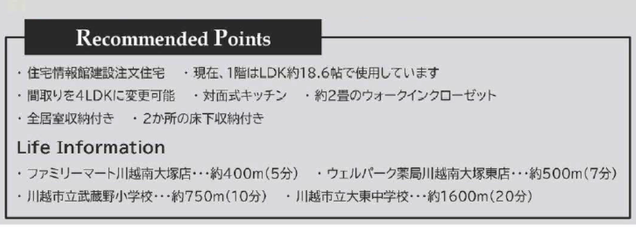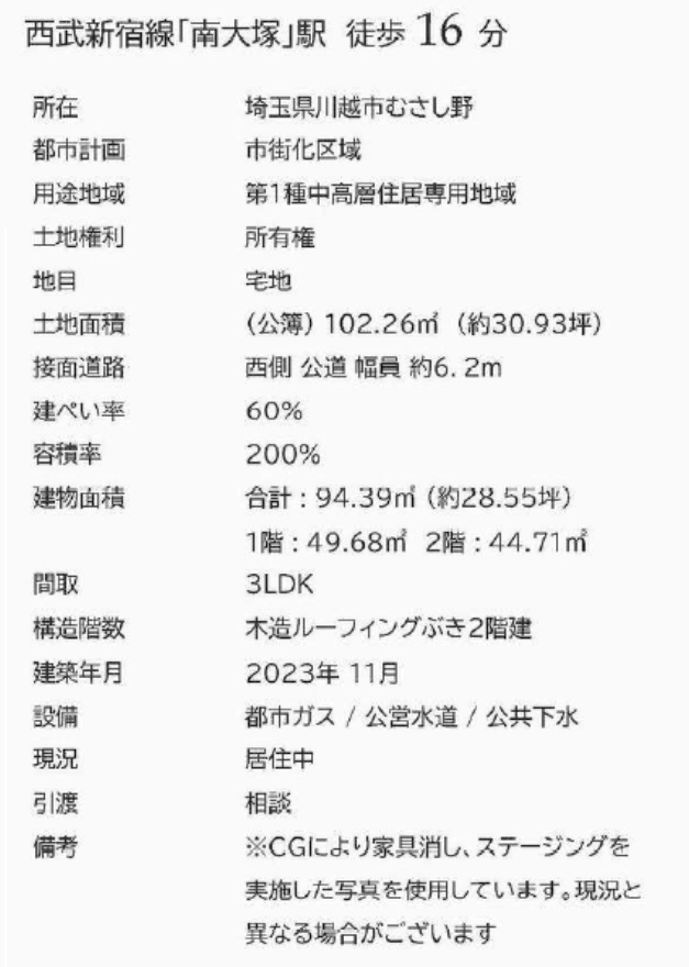 ☆川越市むさし野 中古戸建て ☆西武新宿線『南大塚駅』徒歩16分! ☆敷地面積30坪! ☆令和5年11月築、4LDK中古住宅! ☆対面キッチン、浄水器、浴室乾燥機、追い炊き機能、温水洗浄便座、ワイドバルコニー、床下収納、ウォークインクローゼット、シューズクロークなどの設備! ☆築浅で室内外ともにキレイです! ☆川越市立武蔵野小学校まで徒歩10分、大東中学校まで徒歩20分の通学距離です! ☆公営水道、本下水、都市ガス ☆ファミリーマート川越南大塚店(約400m)、ウェルパーク薬局川越南大塚東店(約500m) |