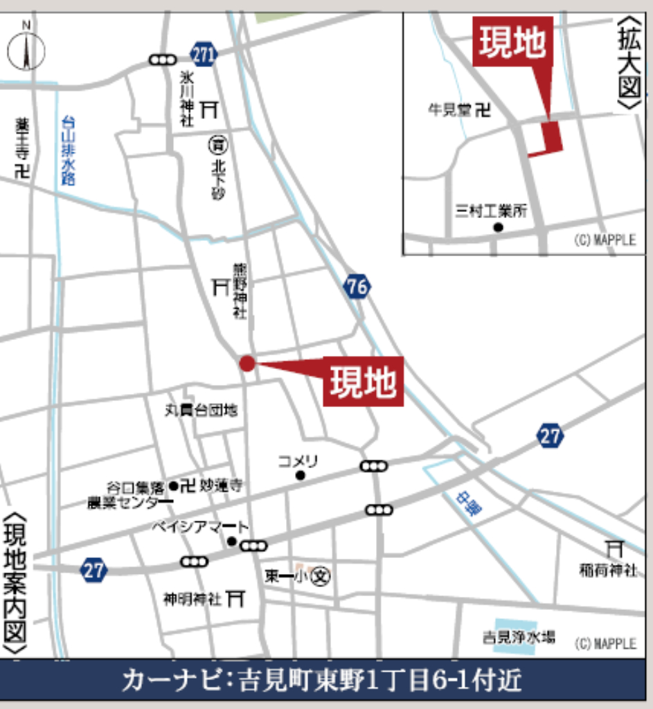 【1号棟】 ☆クレイドルガーン比企郡吉見町東野第22 新築一戸建て 全2棟現場 ★仲介手数料無料新築一戸建て! ☆東武東上線『東松山駅』バス23分、バス停『丸貫』停歩8分! ☆敷地面積58坪! ☆広々使える18帖のリビングと個室としても続き間としても使用できる洋風和室! ☆2部屋から出入り可能で使い勝手の良い幅広バルコニー! ☆システムキッチン、浴室乾燥機付きユニットバス、シャワートイレ、シャワードレッサー、24時間換気システム、人感センサー付き玄関灯、TVモニター付きインターホン、防犯カメラ、ペアガラスなどの設備! ☆駐車場2台! ☆吉見町立東第一小学校、吉見中学校の通学区です ☆瑕疵担保保険加入物件! ☆住宅性能評価書取得予定物件! ☆フラット35S利用可! ☆ZEH水準仕様住宅! ☆公営水道、本下水、都市ガス ☆ベイシアマート吉見店(約684m)、ドラッグストアセキ吉見店(約1825m)、吉見郵便局(約2060m) ※現地販売業者さんは売主ではございません。アンケート等の手続きをされますと当社での物件紹介(仲介料手数料無料)が出来なくなります。ご内覧を希望のお客様は当社にて立ち合い・ご案約をさせて頂きますのでお手数ですがTEL049-285-6300までお電話下さい。急いで現地へ向かいますので御連絡お待ちしております。 |