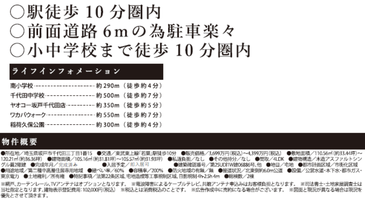 【1号棟】 ☆坂戸市千代田8期 新築一戸建て 2棟現場 ★仲介手数料無料新築一戸建て! ☆家族の会話が増えるリビングイン階段! ☆フラット35S利用可! ☆公営水道、本下水、都市ガス ☆駐車場2台 ☆日当り良好! ☆小学校徒歩10分以内! ☆道路や区画の整った住宅地!リビングに明るい吹抜!収納充実ウォークインクローゼット! ※現地販売業者さんは売主ではございません。 アンケート等の手続きをされますと当社での物件紹介(仲介料手数料無料)が出来なくなります。ご内覧を希望のお客様は当社にて立ち合い・ご案内をさせて頂きますのでお手数ですがTEL049-285-6300までお電話下さい。急いで現地へ向かいますので御連絡お待ちしております。(^o^) |