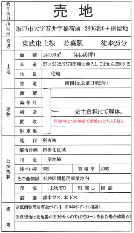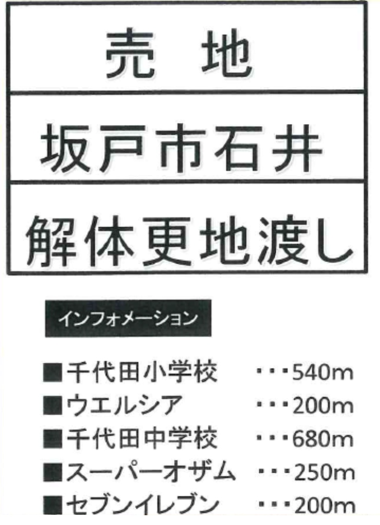 ☆坂戸市石井 建築条件無売り地! ☆東武東上線『若葉駅』徒歩25分! ☆土地面積44坪! ☆建築条件はありません。お好きなハウスメーカーで建築できます! ☆建物解体後更地渡し! ☆区画整理地内の住宅地! ☆坂戸市立千代田小学校まで徒歩7分、千代田中学校まで徒歩9分の通学距離です! ☆公営水道、公共本下水、都市ガス ☆どなたでも建築できる土地です!(34条11号適用含む) ☆ウエルシア(約200m)、スーパーオザム(約250m)、セブンイレブン(約200m) |