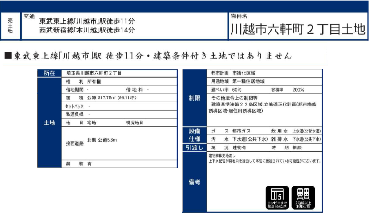 ☆川越市六軒町2丁目 建築条件無売り地! ☆東武東上線『川越市駅』徒歩11分! ☆西武新宿線『本川越駅』徒歩14分! ☆土地面積96坪! ☆建築条件はありません。お好きなハウスメーカーで建築できます! ☆駅や商業施設も近く立地の良い広々した土地! ☆更地での引渡し! ☆川越市立月越小学校、富士見中学校の通学区です ☆公営水道、公共本下水、都市ガス ☆どなたでも建築できる土地です!(34条11号適用含む) ☆セブンイレブン川越仲町店(約380m)、コープみらいコープ仲町店(約620m)、ドラッグセイムス月吉店(約720m)、六塚稲荷児童遊園(約540m)、TAIRAYA月吉店(約700m)、時の鐘(約800m) |