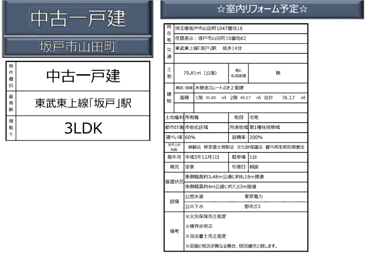 ☆坂戸市山田町 中古一戸建て ☆東武東上線『坂戸駅』徒歩14分! ☆敷地面積24坪! ☆平成5年12月築、3LDK中古住宅! ☆令和8年4月末リフォーム完了予定!(トイレ新規交換、クロス貼替、床クッションフロア上貼り、ハウスクリーニング、防蟻処理、モニターインターホン設置) ☆閑静な住宅街! ☆東×南道路につき陽当たり良好です! ☆坂戸市立坂戸小学校まで徒歩12分、坂戸中学校まで徒歩10分の通学距離です! ☆駐車場1台! ☆公営水道、本下水、都市ガス ☆ベルク(約400m)、ウエルシア(約600m) |