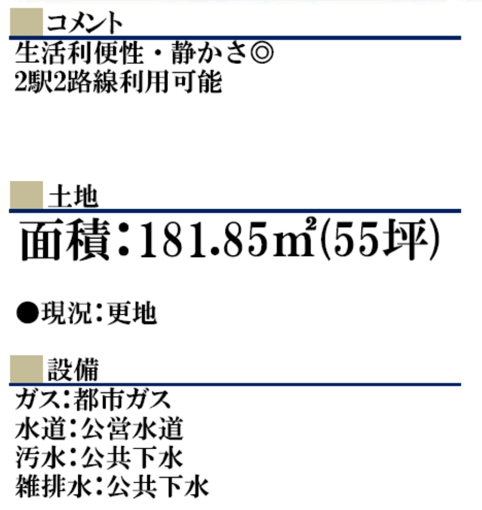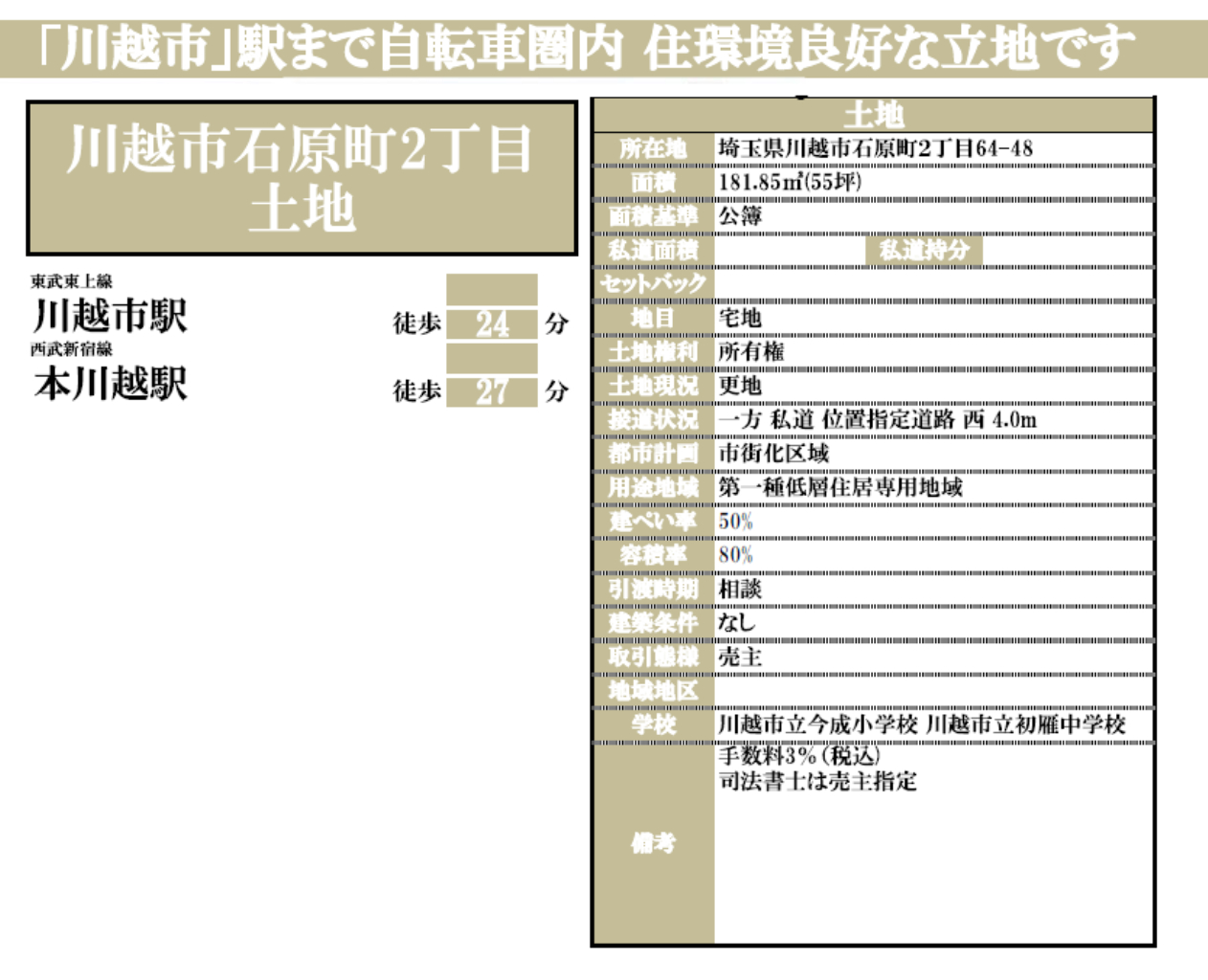 ☆川越市石原町2丁目 建築条件無し売り地! ★仲介手数料無料! ☆東武東上線『川越市駅』徒歩24分! ☆西武新宿線『本川越駅』徒歩27分! ☆土地面積55坪! ☆建築条件はありません。お好きなハウスメーカーで建築できます! ☆西道路に面した整形地! ☆川越市立今成小学校、初雁中学校の通学区です ☆公営水道、公共本下水、都市ガス ☆どなたでも建築できる土地です!(34条11号適用含む) ☆マミーマート神明町店(約895m)、エコス月吉店(約952m)、ローソン川越石原町1丁目店(約517m)、サンドラッグ川越石原店(約411m) |