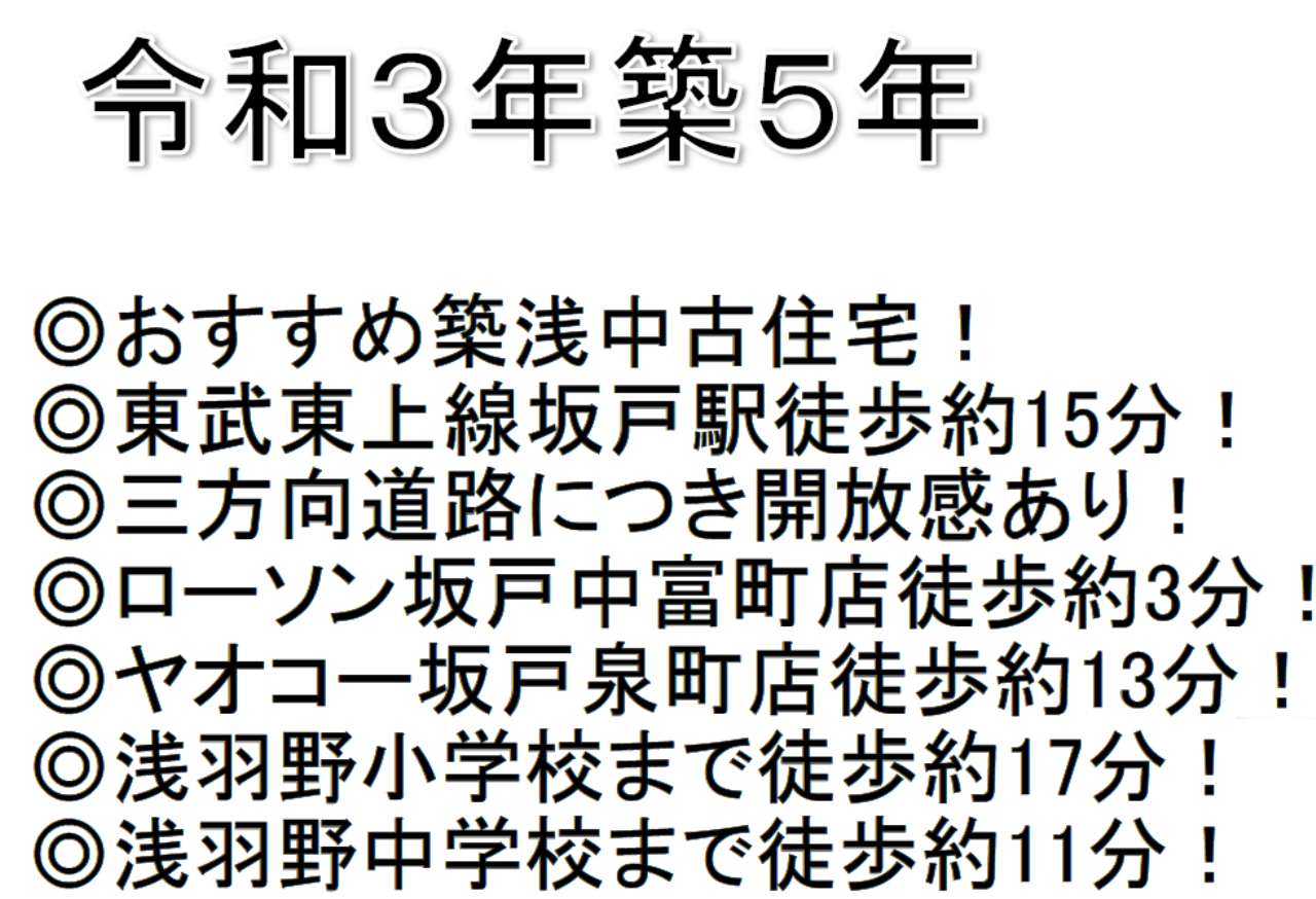 ☆坂戸市中富町令和3年築の築浅中古住宅! ☆三方向道路につき開放感あり ☆リビングは19.4帖の広さ! ☆LDKに4.5帖の和室あり ☆南4道路につき日当り良好! ☆公営水道、本下水、プロパンガス ☆駐車場 |