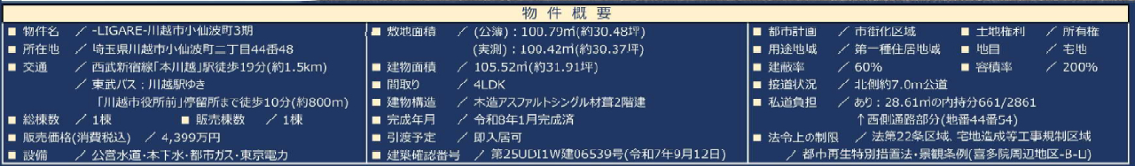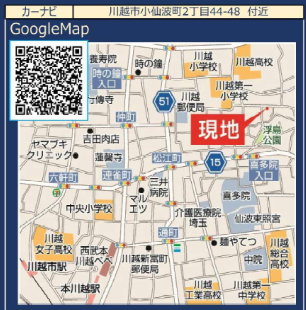 ☆川越市小仙波町3期 新築一戸建て ★新築仲介手数料無料! ☆西武新宿線『本川越駅』徒歩19分! ☆敷地面積30坪! ☆家族みんなで使えるシェアクローク、主寝室のウォークインクローゼットなど収納が充実!! ☆コミュニケーションがとりやすい対面キッチン付きのリビング! ☆駐車場2台! ☆対面キッチン、浄水器、ペアガラス、浴室乾燥機、温水洗浄便座、TVモニターインターホンなどの設備です! ☆川越市立第一小学校、第一中学校の通学区です ☆ZEH水準住宅! ☆フラット35S利用可! ☆公営水道、本下水、都市ガス ☆ここしあ保育園…徒歩1分、ひまわり東幼稚園…徒歩2分、ファミリーマート川越小仙波町2丁目店…徒歩9分、コープみらい仲町店…徒歩10分、業務スーパー川越店…徒歩10分、オーケー川越店…徒歩15分、きっかわ内科クリニック…徒歩11分、川越郵便局… ※現地販売業者さんは売主ではございません。 アンケート等の手続きをされますと当社での物件紹介(仲介料手数料無料)が出来なくなります。ご内覧を希望のお客様は当社にて立ち合い・ご案内をさせて頂きますのでお手数ですがTEL049-285-6300 |
