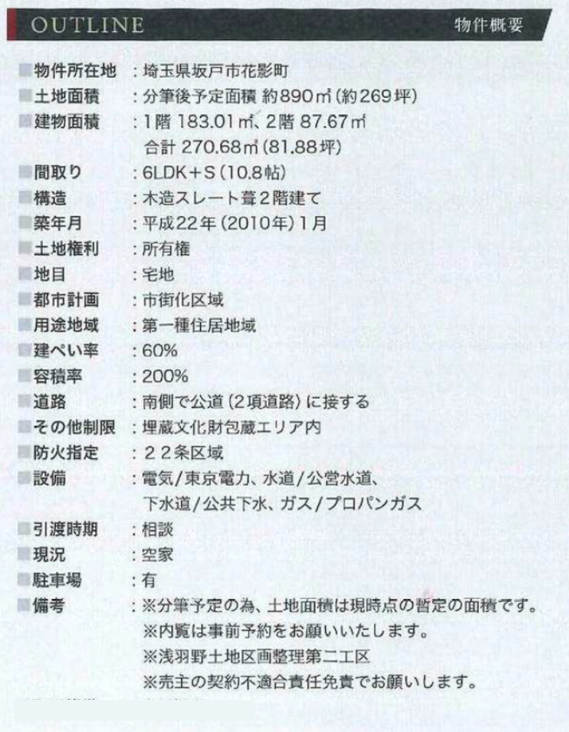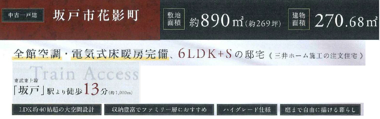 ☆坂戸市花影町 中古戸建て ☆東武東上線『坂戸駅』徒歩13分! ☆敷地面積はとても広い269坪! ☆平成22年1月築、6LDK+納戸の中古住宅! ☆三井ホーム施工の注文建築! ☆広い敷地に大空間設計! ☆全館空調・電気式床暖房完備で快適な住まい! ☆駐車場有! ☆システムキッチン、食器洗浄乾燥機、床暖房、ルーフバルコニー、出窓、ウォークインクローゼット、シューズインクローゼットなどの設備あり! ☆坂戸市立浅羽野小学校まで徒歩7分、浅羽野中学校まで徒歩6分の通学距離です! ☆公営水道、本下水、プロパンガス ☆ビッグーエ(約240m)、ベルク(約1500m)、関越病院(約800m)、坂戸郵便局(約1000m) |