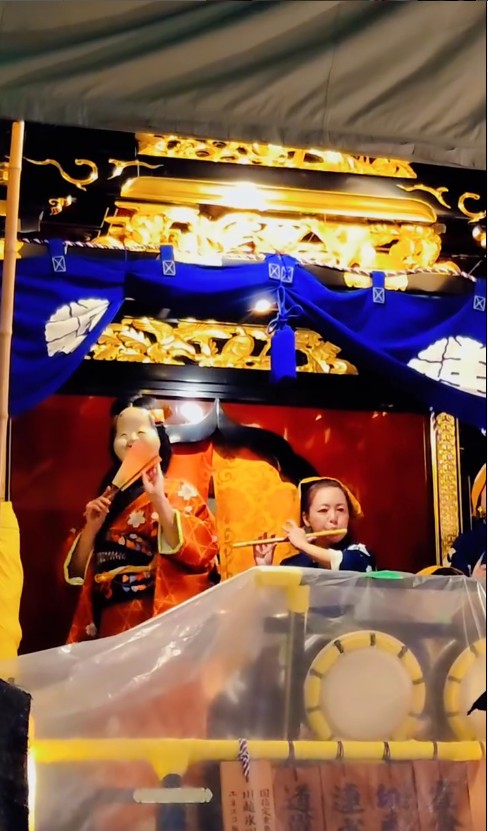 写真のように、提灯に明かりが灯り、色鮮やかな衣装をまとった人形やお囃子(はやし)の演奏が始まります。