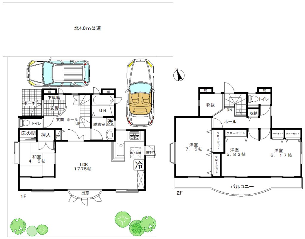 駅近物件にありがちな「隣家との圧迫感」はありません。カースペース2台を確保しつつ、空地を設けた贅沢な配置です。